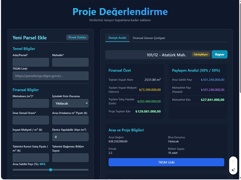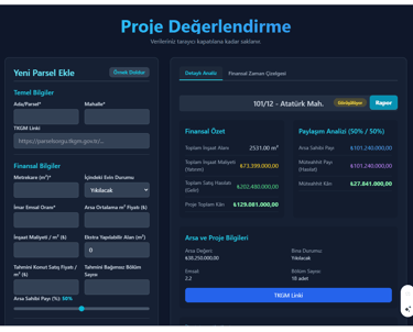 Sizleri, arsa ve proje geliştirme süreçlerinizi kökten değiştirecek yeni nesil Proje Değerleme Uygulamamız ile tanıştırıyoruz. Bu güçlü araç, yatırım kararlarınızı veriye dayandırmanız, risklerinizi minimize etmeniz ve kârlılığınızı en üst düzeye çıkarmanız için tasarlandı.