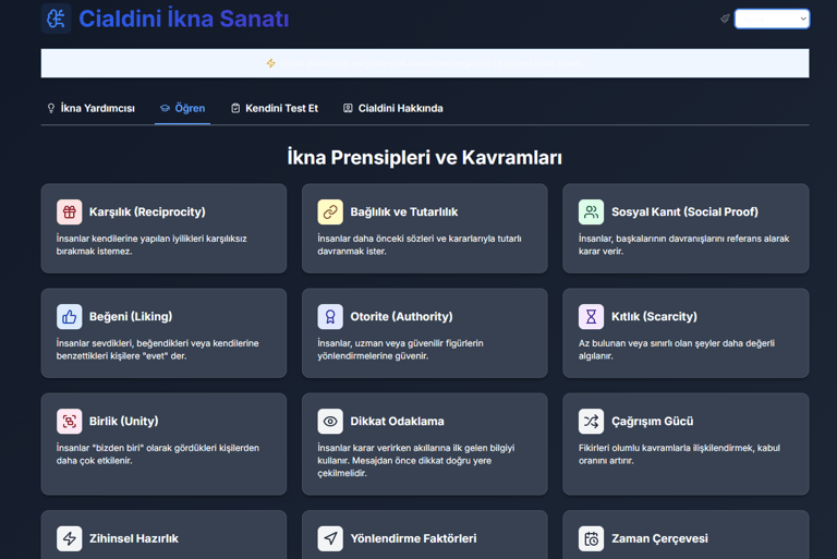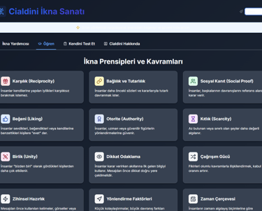Bu uygulama, Cialdini’nin Altı Evrensel İkna İlkesini (Karşılıklılık, Tutarlılık, Sosyal Kanıt, Otorite, Beğeni, Kıtlık) dijital bir deneyime dönüştürerek, kullanıcıya yalnızca teoriyi değil, gerçek etkileşimler içinde uygulama pratiğini kazandırır.